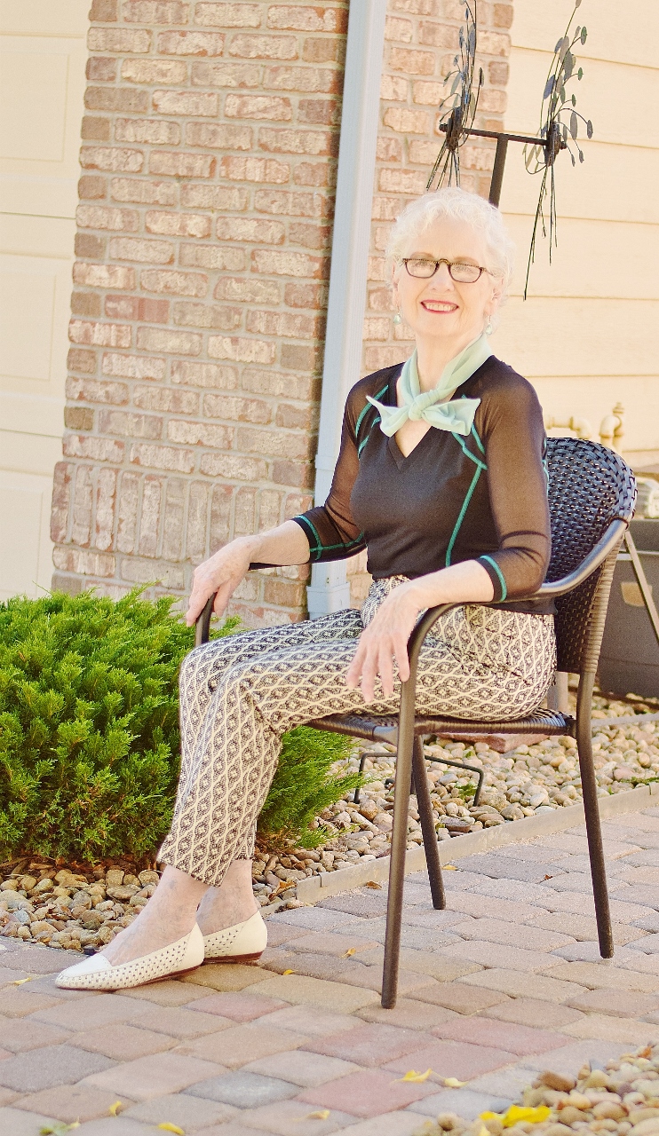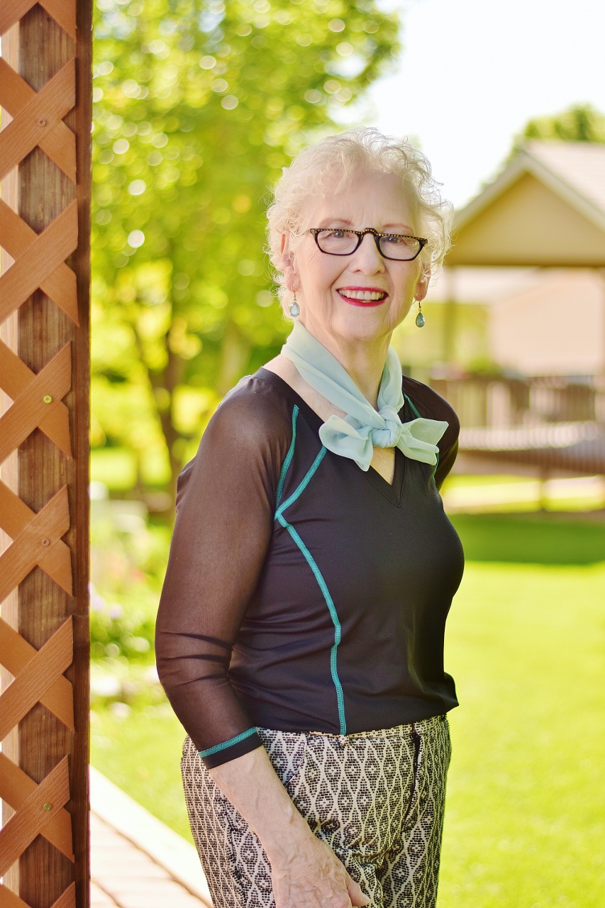 Since black is not the most flattering color on my mom, I had her wear a mint colored scarf near her face.