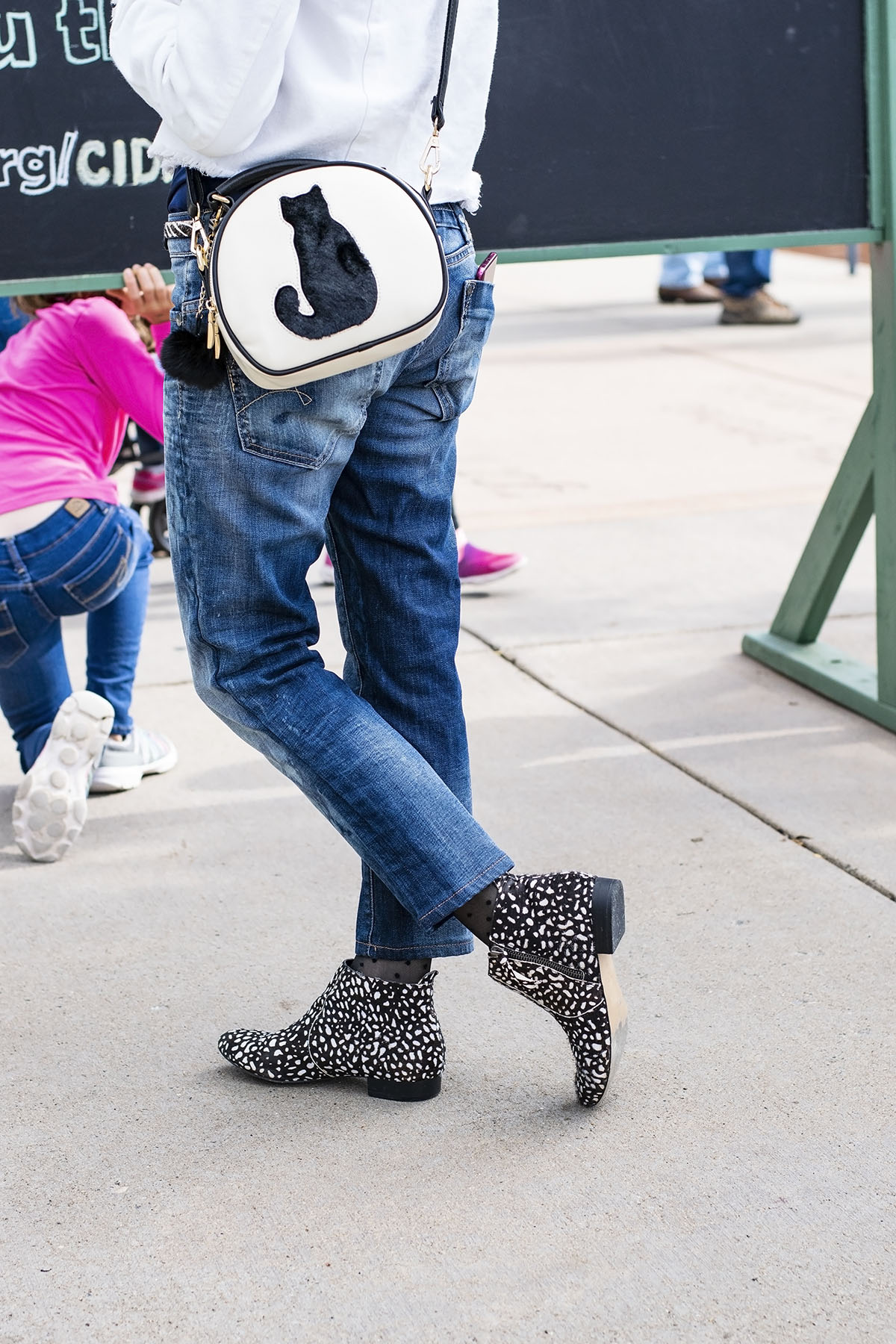 Since it was a cooler day, I even added in some print tights under my jeans. Normally I would have shown off my bare ankles, but I needed the warmth. Which is why I also added in my hand knitted scarf.