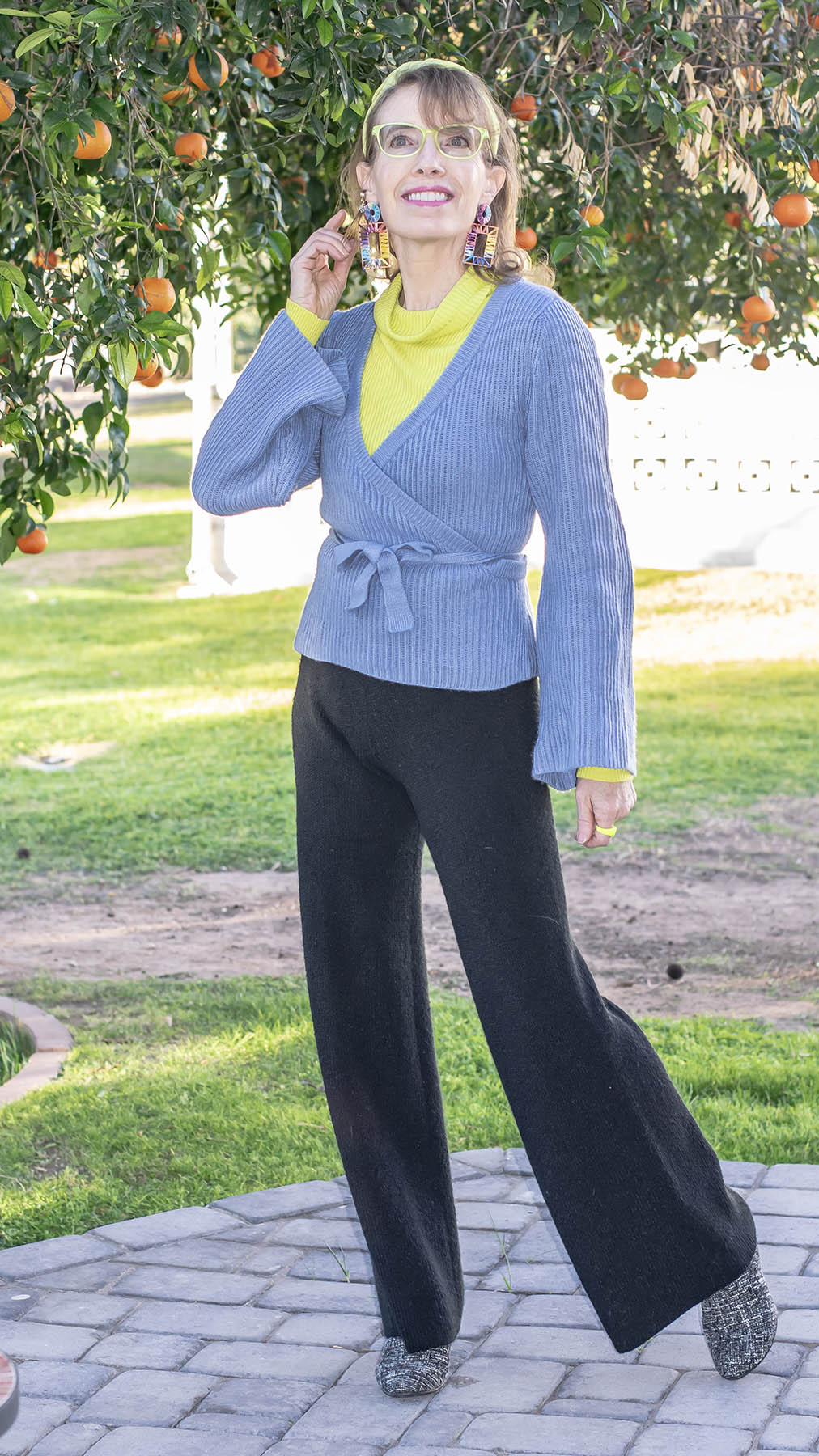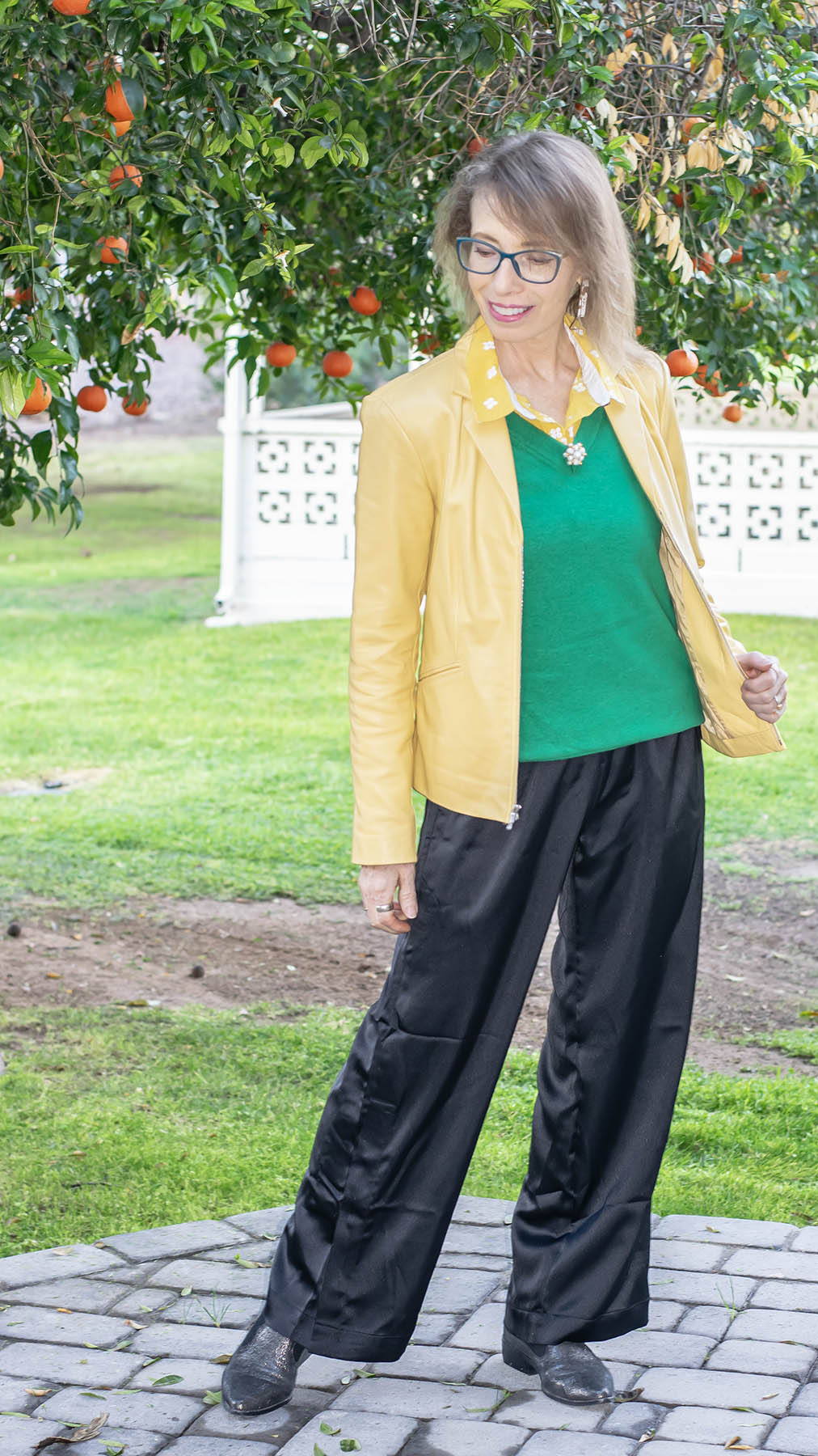 Since we are discussing color palettes for spring, pairing yellow with green seems obvious. Since Mother Nature is showing off with all kinds of blooms and colors, I paired two yellow tops with a green sweater.