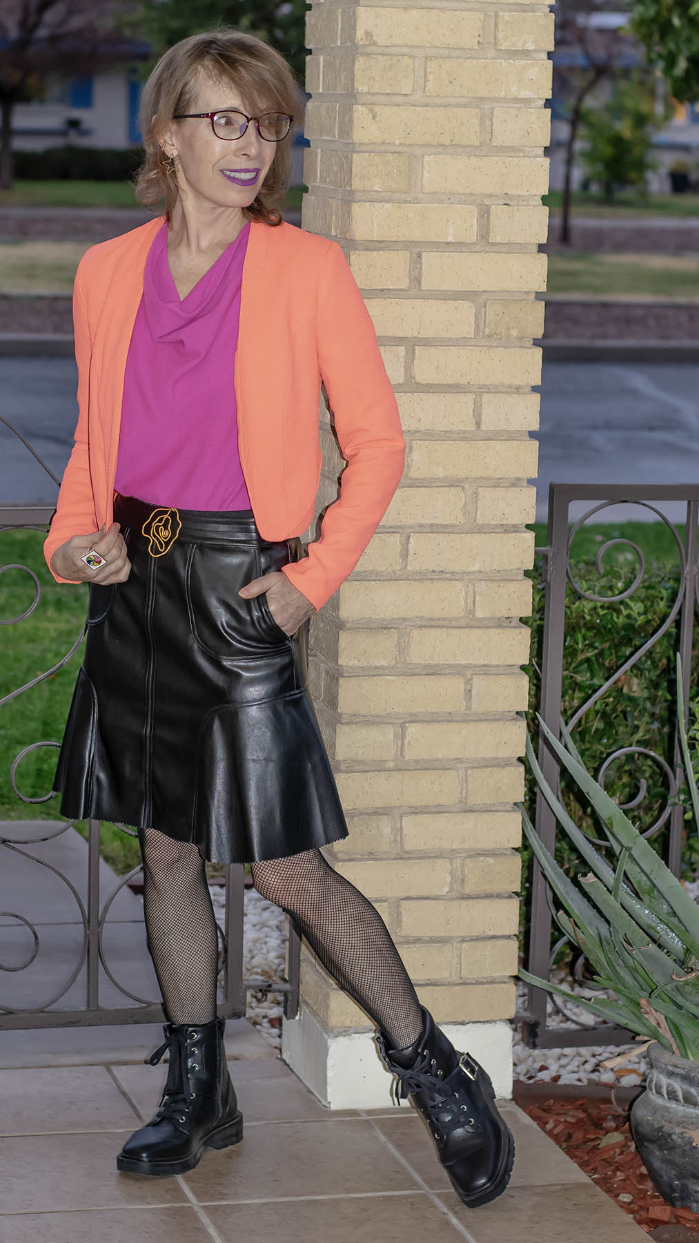 Insider tip: I used a scarf pendant as my “buckle” on the waist of this skirt. While I love using a bling pin at times, I didn’t want to put a hole in this faux leather skirt. This pendant is made by my friend and is only $15.