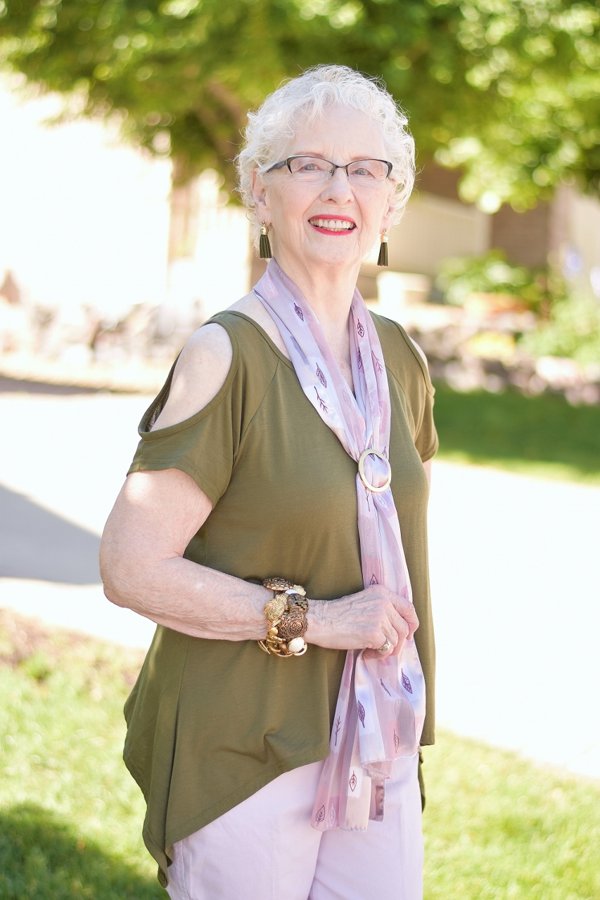 Charlotte’s (70+) Outfit: And in the last example of adding accessories to solid colors, my mom chose a scarf for her decoration!