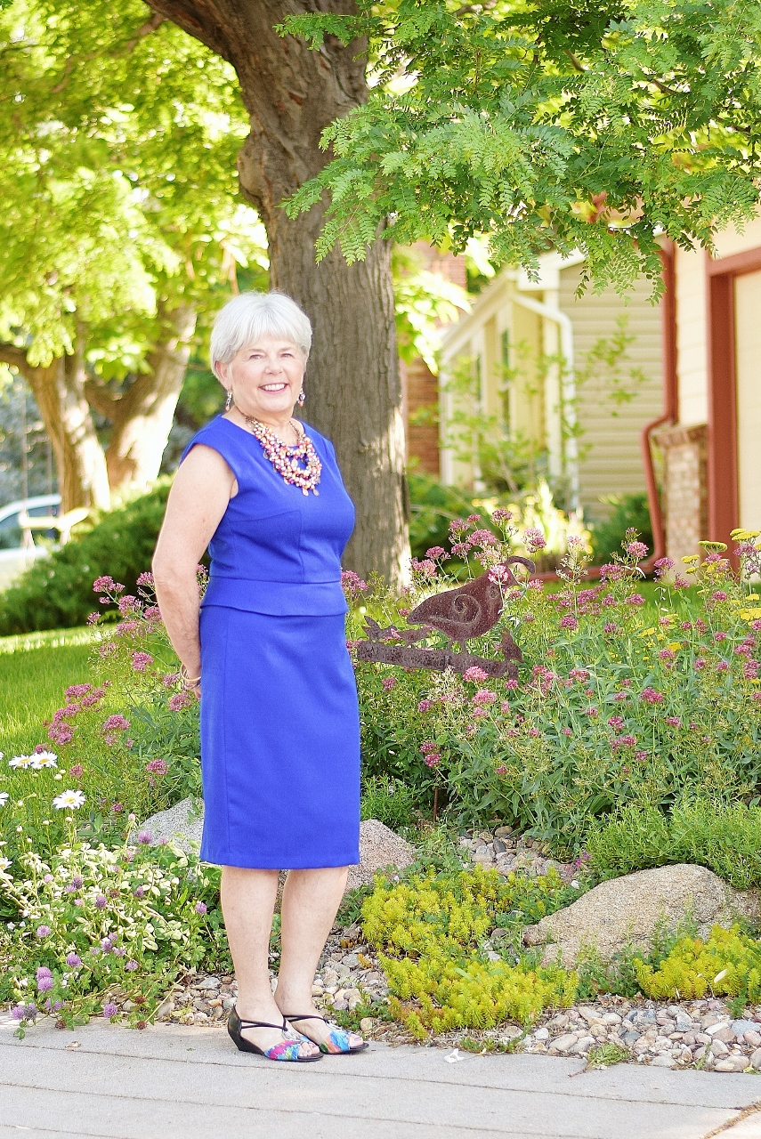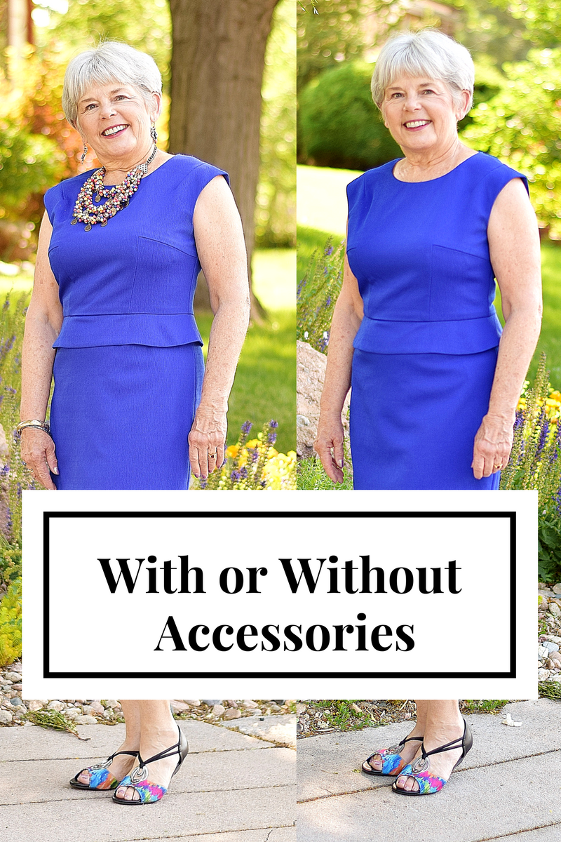 I do love one color dresses though because you can pair almost anything else with them. Just because the dress is one color doesn’t make it uninteresting. For instance, Nancy’s dress has a small peplum at the waist. However, even with these details, I still love to mix in accessories with solid colors.