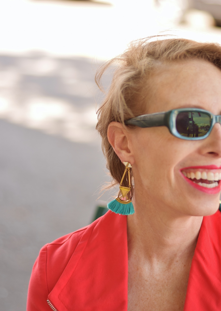 To add in a third color for this outfit, I chose turquoise earrings, bracelet & sunglasses.