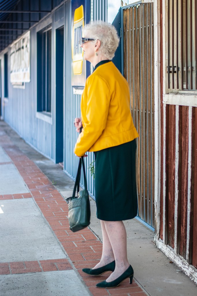 Not every dress needs a jacket, yet it’s certainly an easy way to change up the look. For this outfit, my mom grabbed a recent thrift store purchase that adds brightness to the darker dress.
