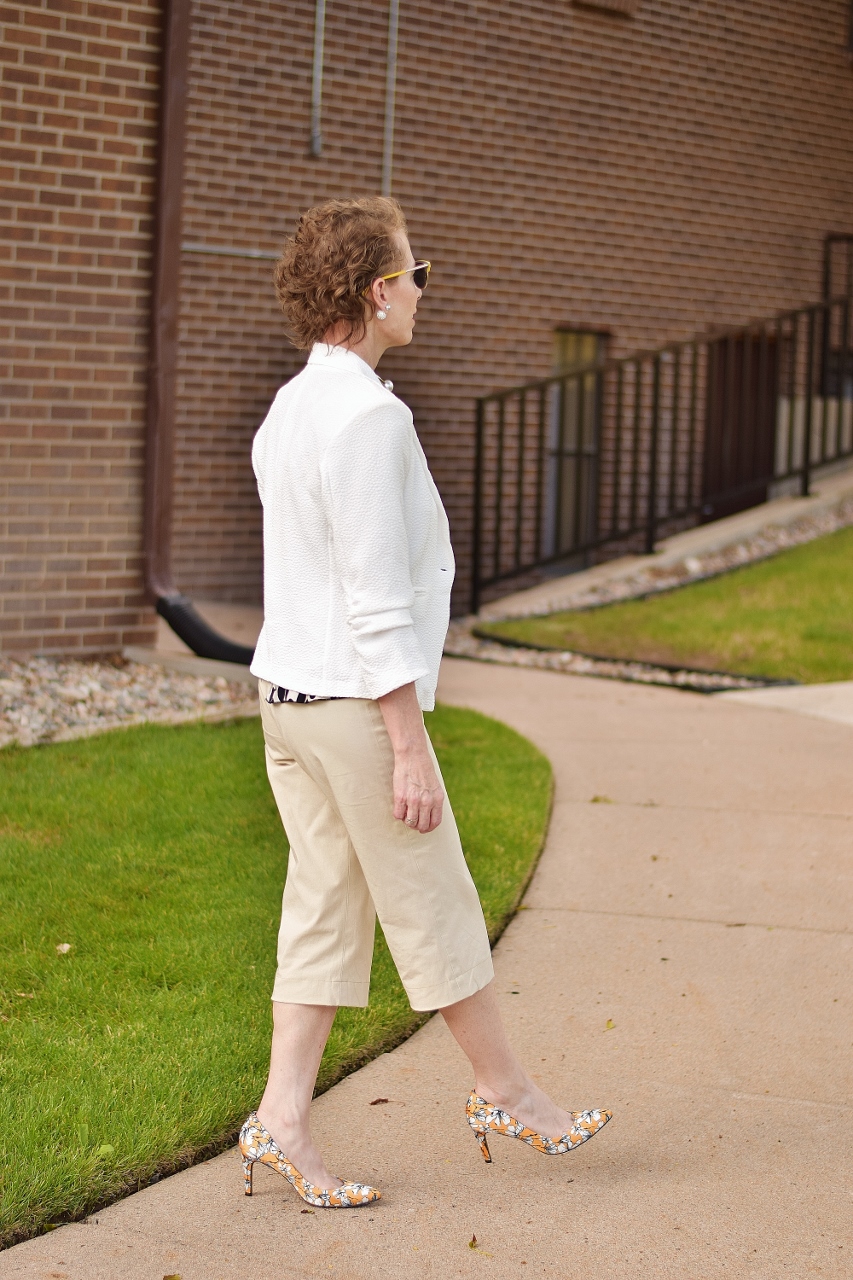 Even though most of us think of our capris as a casual clothing item, making them work for a dressy event can be possible. I think it really comes down making the other items in our outfit be the focal point. Of course, you may not agree, and I’d love to hear your reasoning!!