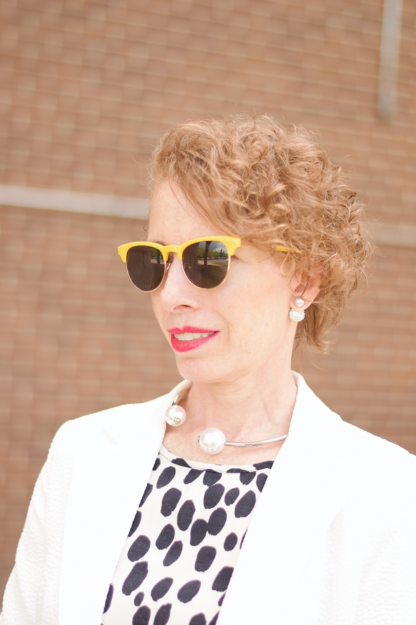 For some reason, I just couldn’t find anything that I loved in my closet. I think I was searching for something like this one, or this one, but to no avail. My one sequin top is long sleeve and just didn’t seem right with these capris. So I came up with the thought to wear a black & white shirt along with a jacket, heels, and pearls.