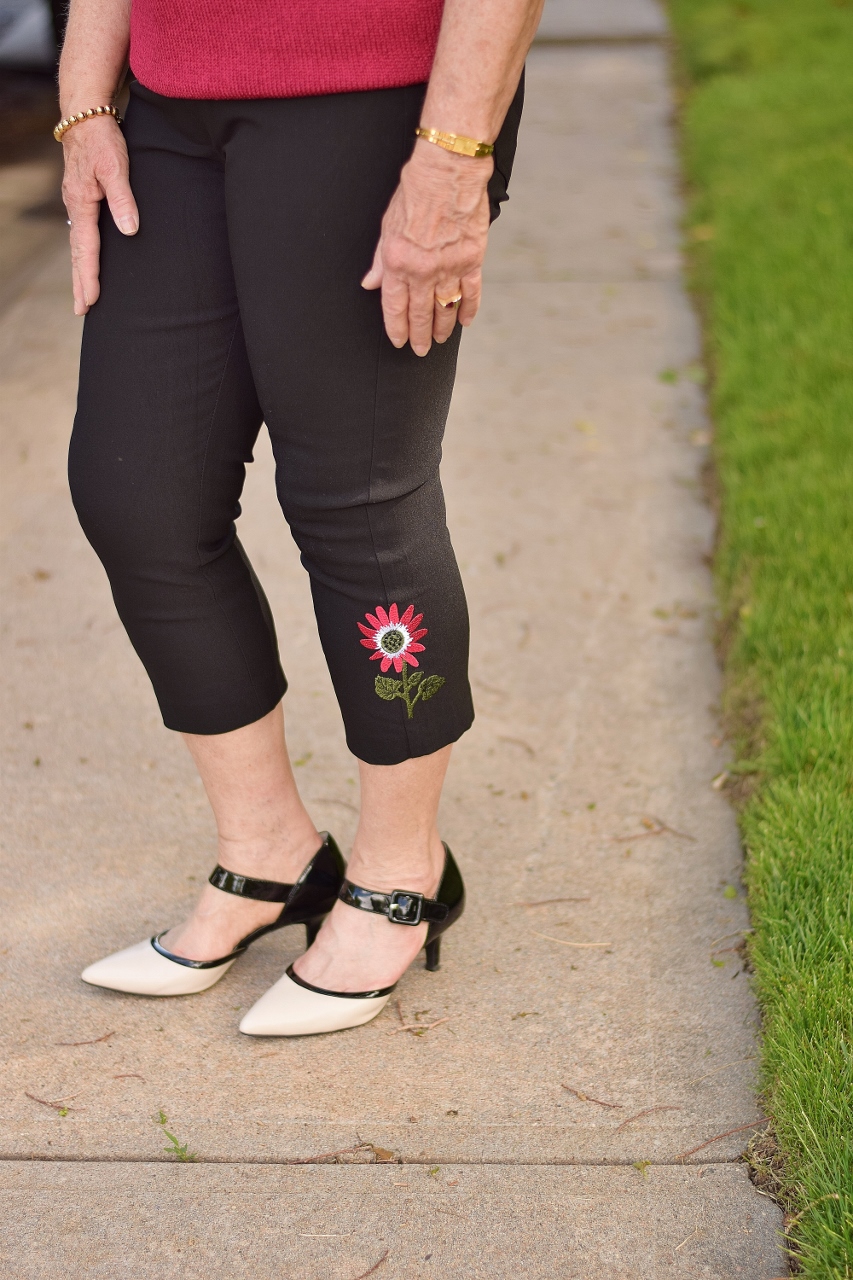Even though Nancy’s pants have embroidery on them, the color seems to make them less casual! Of course, if you prefer plain black for your bottoms, then those type aren’t too hard to find!