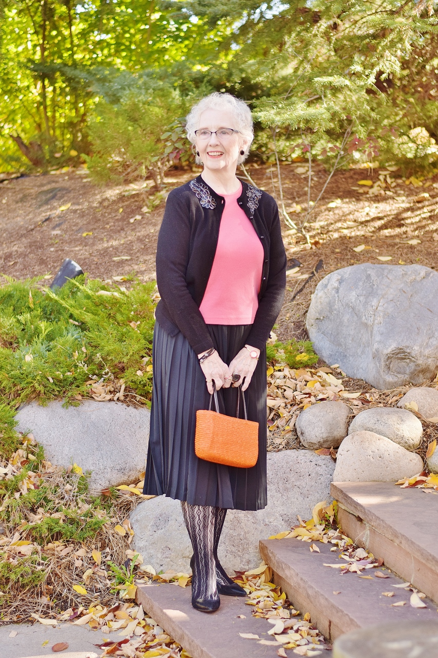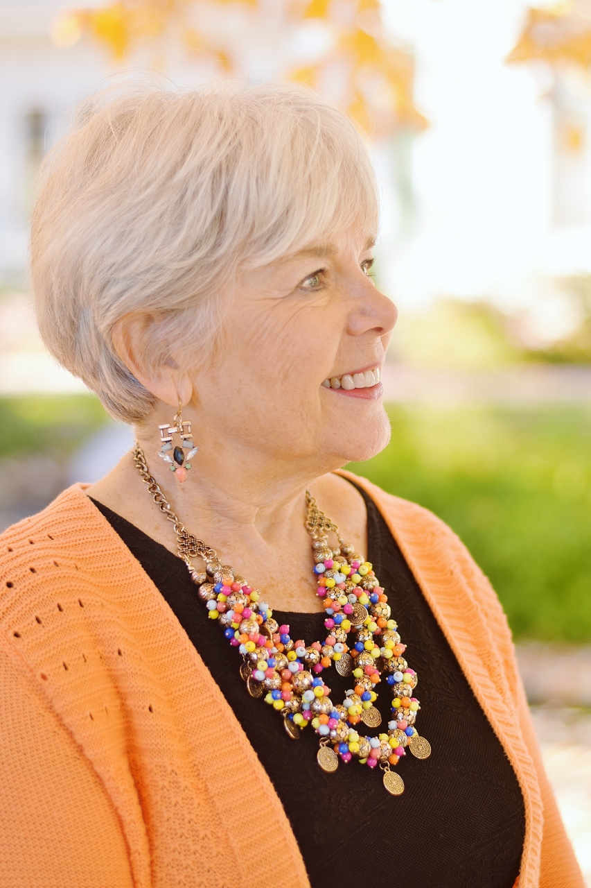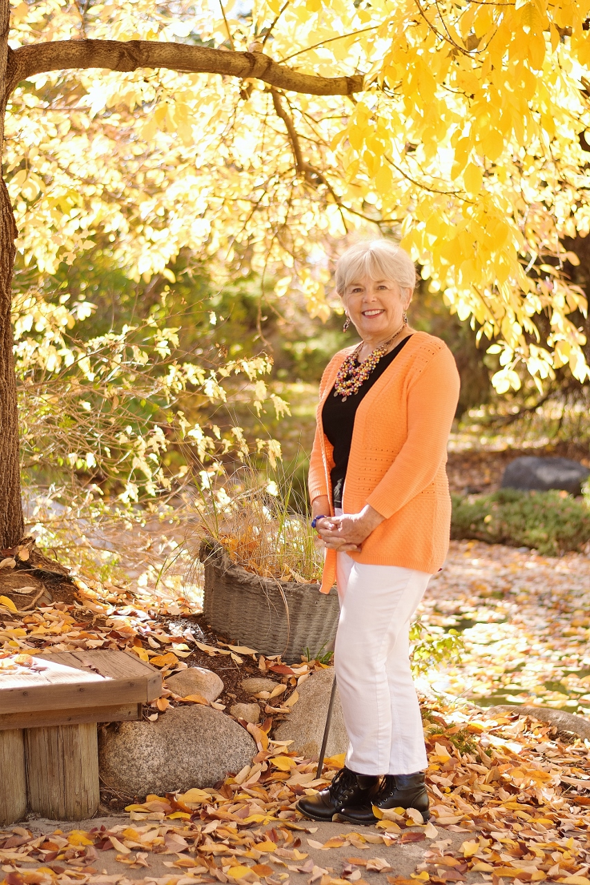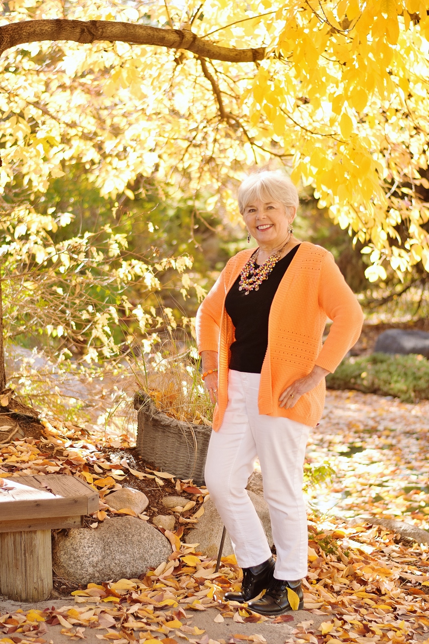 Nancy’s (60+) Outfit: For Nancy’s orange and black, I had her grab her white jeans, since they work all year round now.