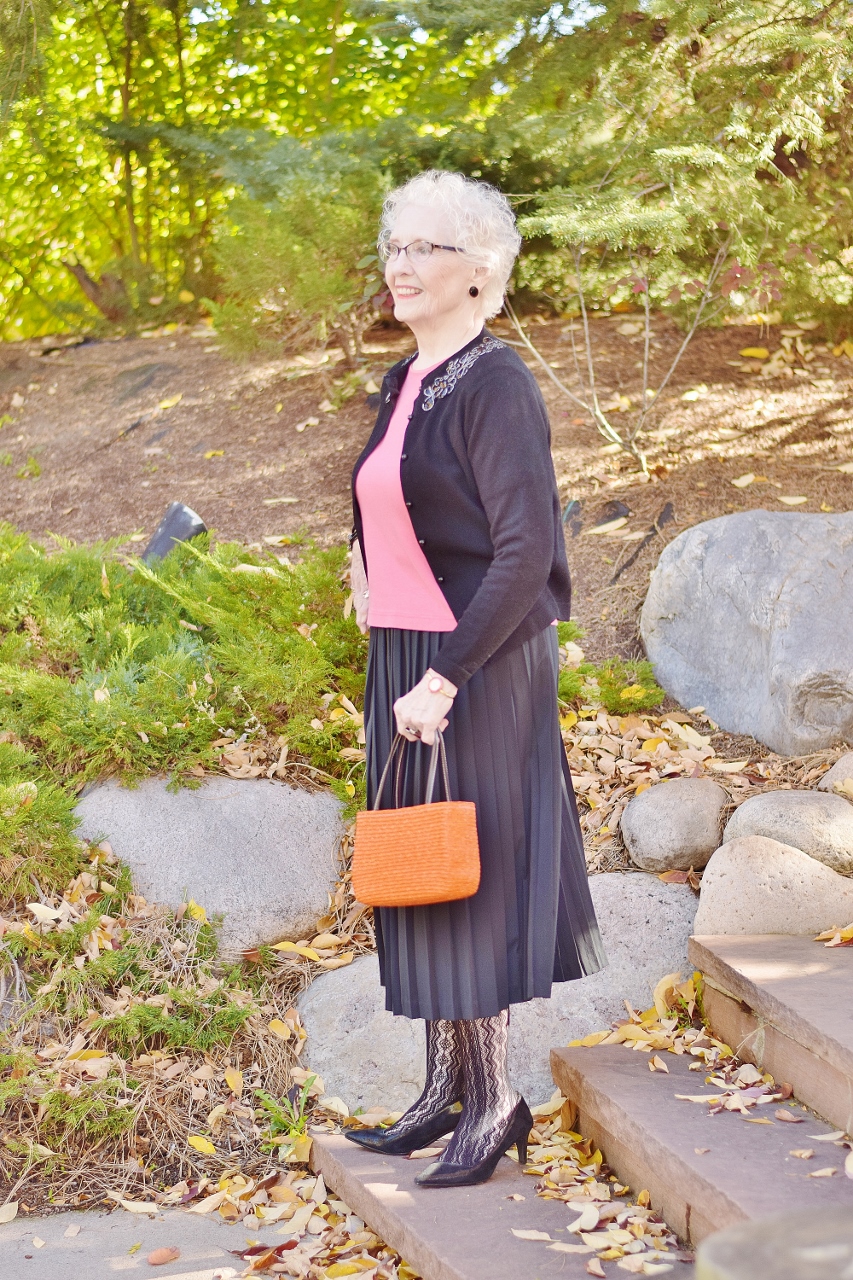 These pleated skirts have even been popular among the young women lately. So if you have one languishing in the back of your closet, now is the time to pull it out. Either that or I can point out a couple of great ones under $50. There are many in different lengths and materials that can be so fun. They come in faux suede, patterned, asymmetrical, elasticized waistbands, super long or a little shorter. And trust me when I say that you can wear these with sneakers, brogues or boots.