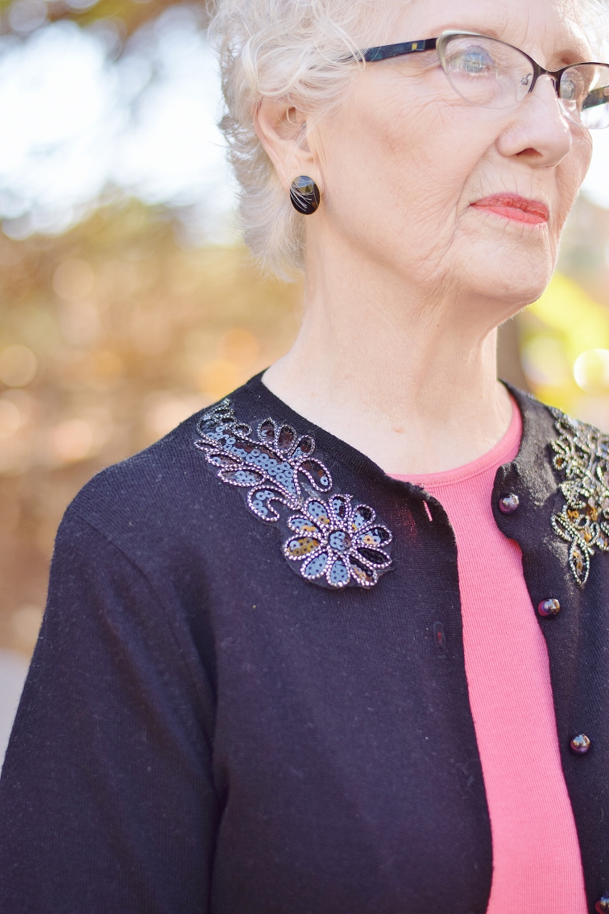 Let me brag some more about my mother’s creativity. The embellishments on this sweater? They were actually headbands, that my mom removed the elastic portion from and sewed them on her cardigan instead.