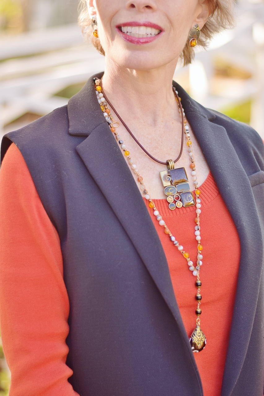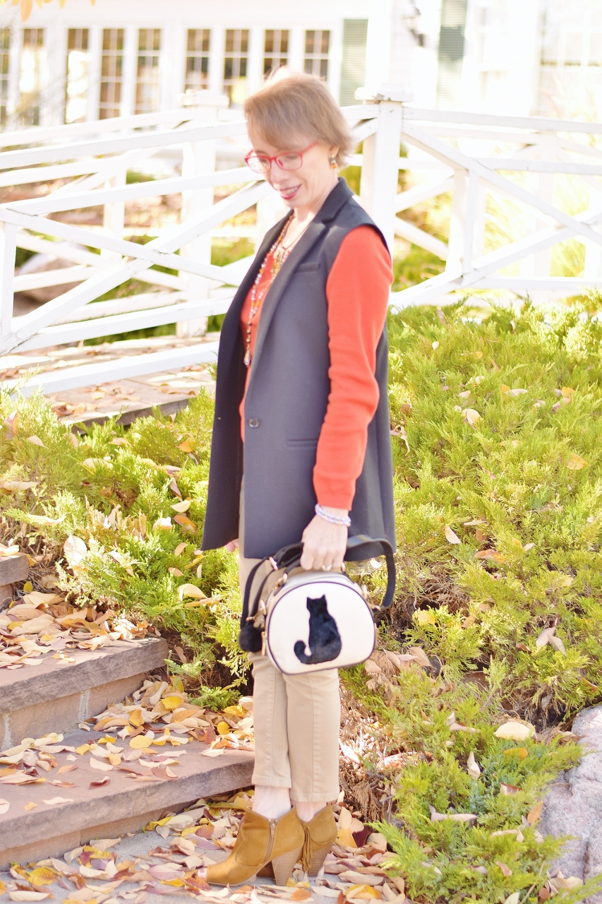 As for my black piece, I chose this sleeveless blazer. Or the women around my age might call it a vest—ha ha! Like I talked about in our fall trends post with the longer cardigans, the longer pieces are making a comeback. And this vest used to be a jacket. I had my mom remove the sleeves so I’d wear it more.
