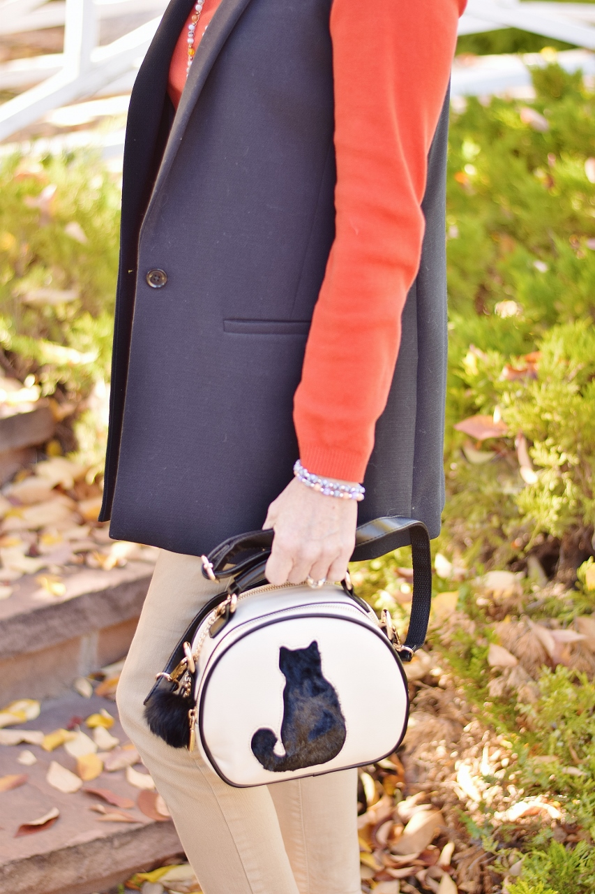 I actually consider her top more of a coral color, and her purse more of an orange. And this isn’t just my photos, because it looked the same in real life too. But in reality, maybe that’s a great way to wear orange and black without looking too Halloweenish. Find a shade of orange that isn’t as pumpkin hued.