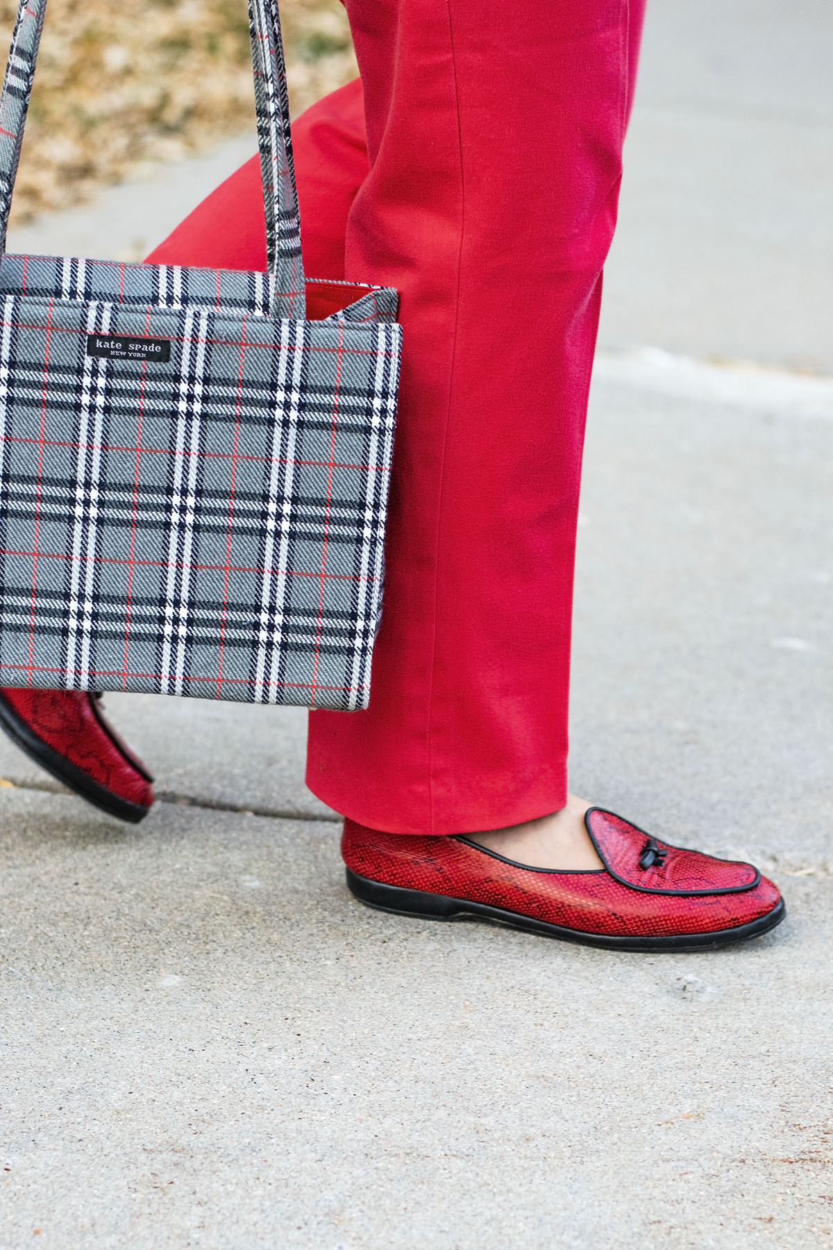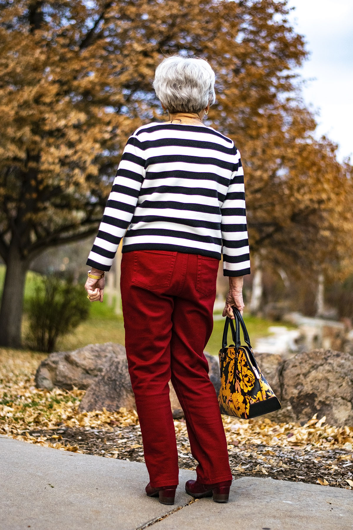 My mom wanted comfortable shoes because we were heading to the mall after these photos. That’s where these shoes come in, and so she chose red jeans to match them.