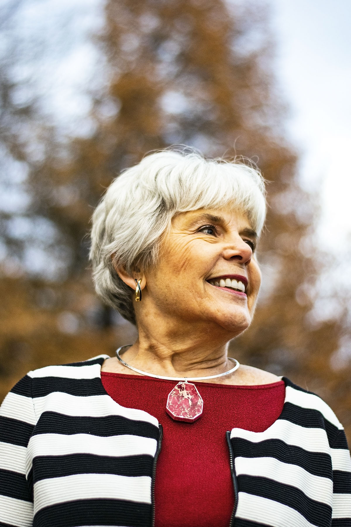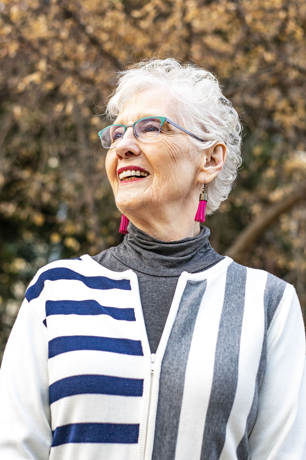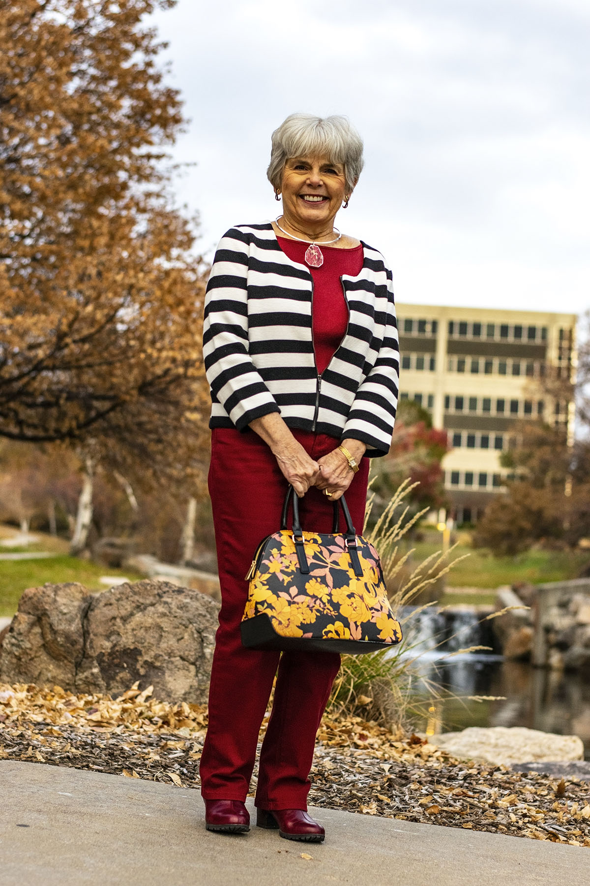 Nancy liked the idea of keeping the jacket open with a different color under it to break up the stripes. It’s also the perfect way to show off the gorgeous pendant that she just bought at a holiday market.