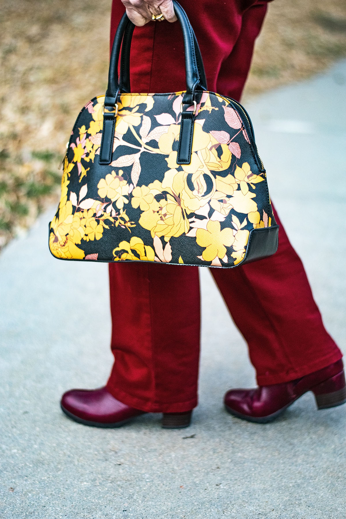 I love that Nancy is mixing prints by adding in a floral purse for this outfit. We’ve talked about mixing prints many times on the blog, and adding in the extra print in your purse is one of the easy ways to do it. The purse is also a great way to add in some florals to the winter like we discussed last week.