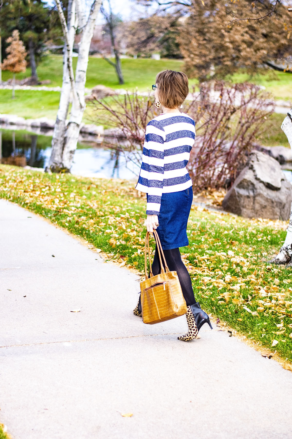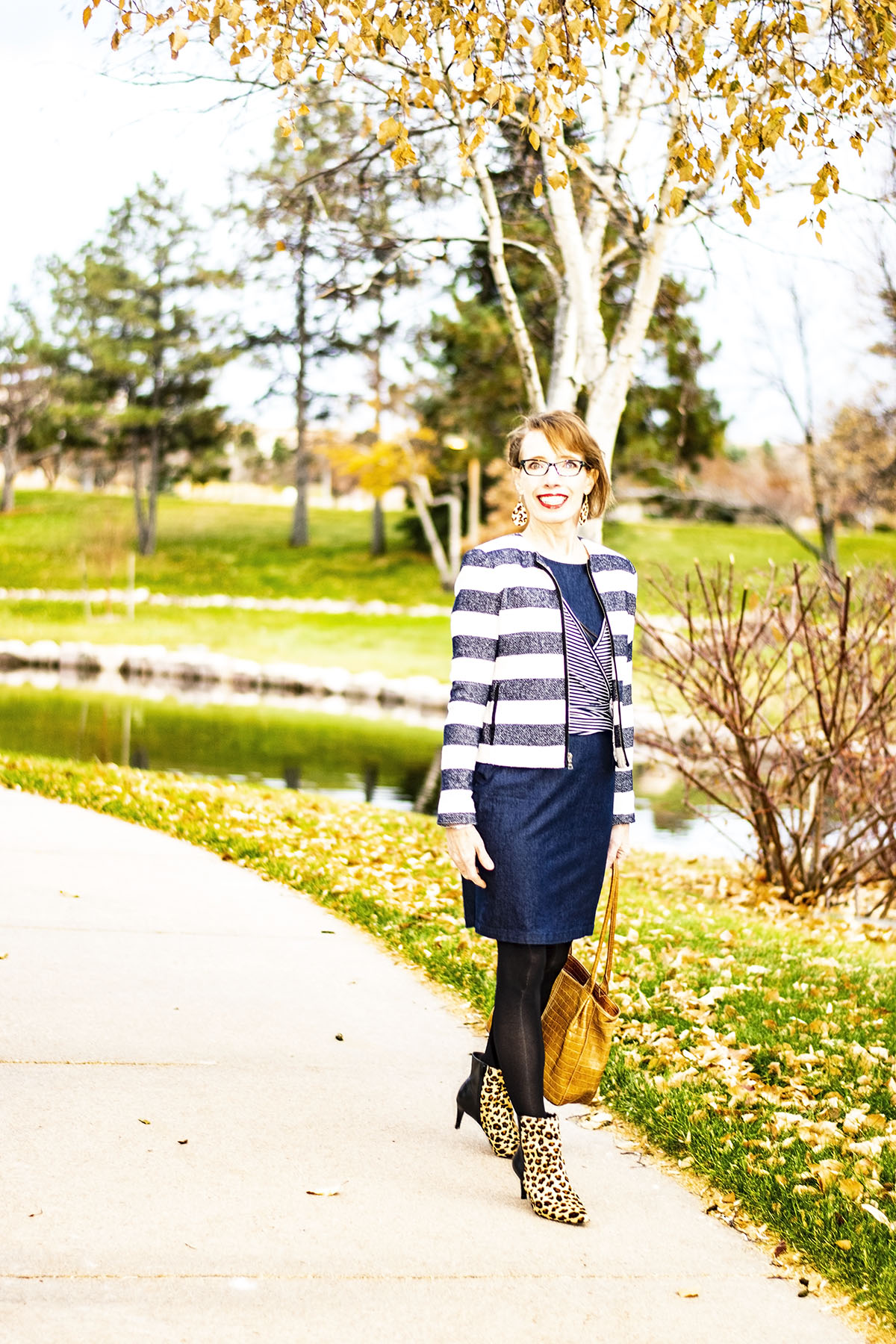 Now here’s another way to wear stripes and maybe not feel as wide? Find a topper where the stripes are horizontal and vertical. Let me just reiterate that it’s not bad to look wide, but I know I won’t convince many of you in only one post.