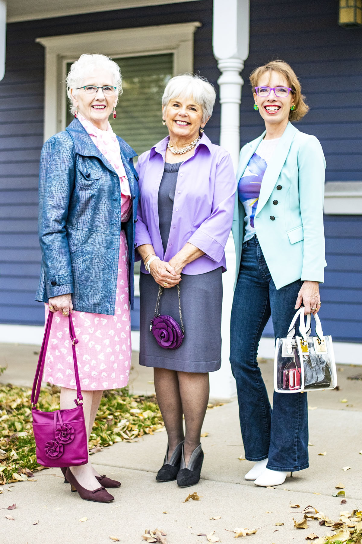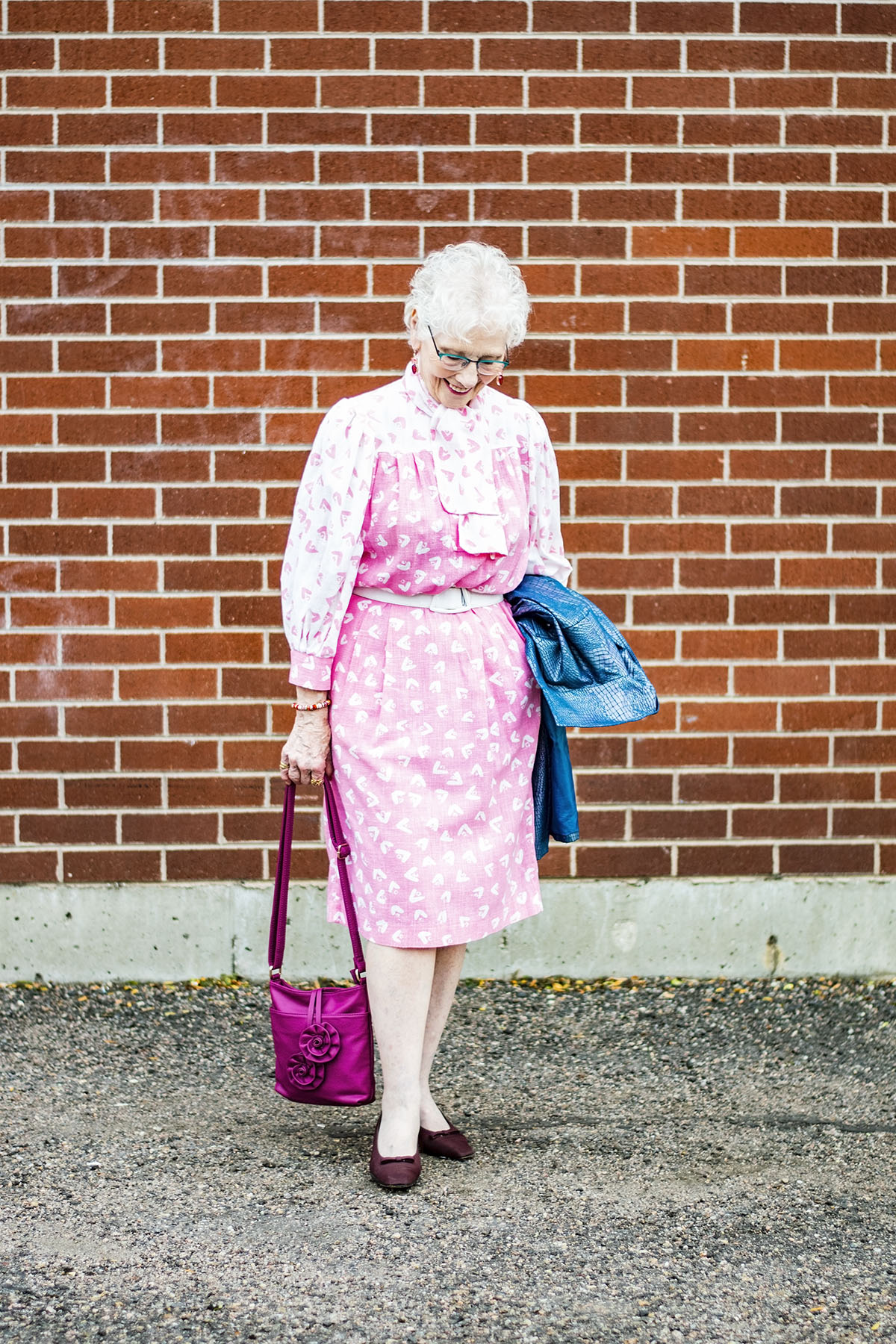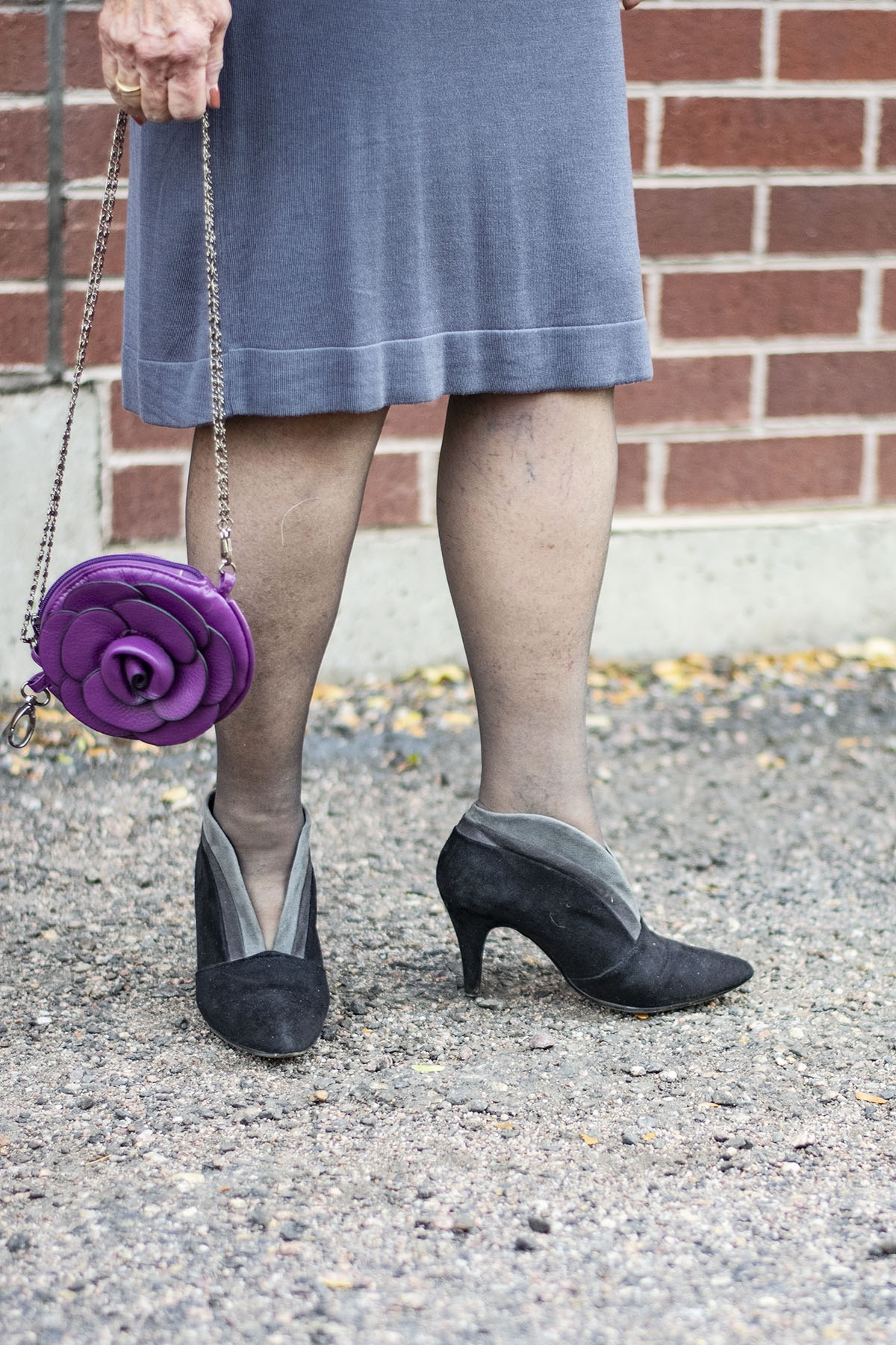 In order to “winterize” the dress, I suggested this dark blue jacket for another layer. And even though my mom would have normally worn her pink shoes with this dress, a darker shade of the same color can be a great way to finish it off.