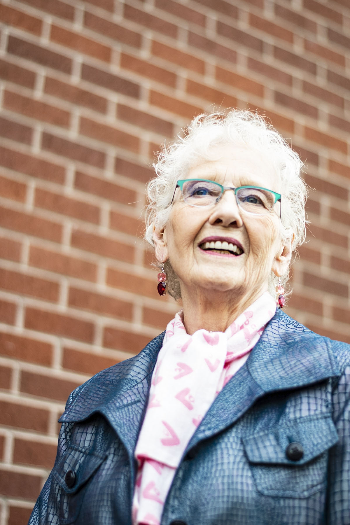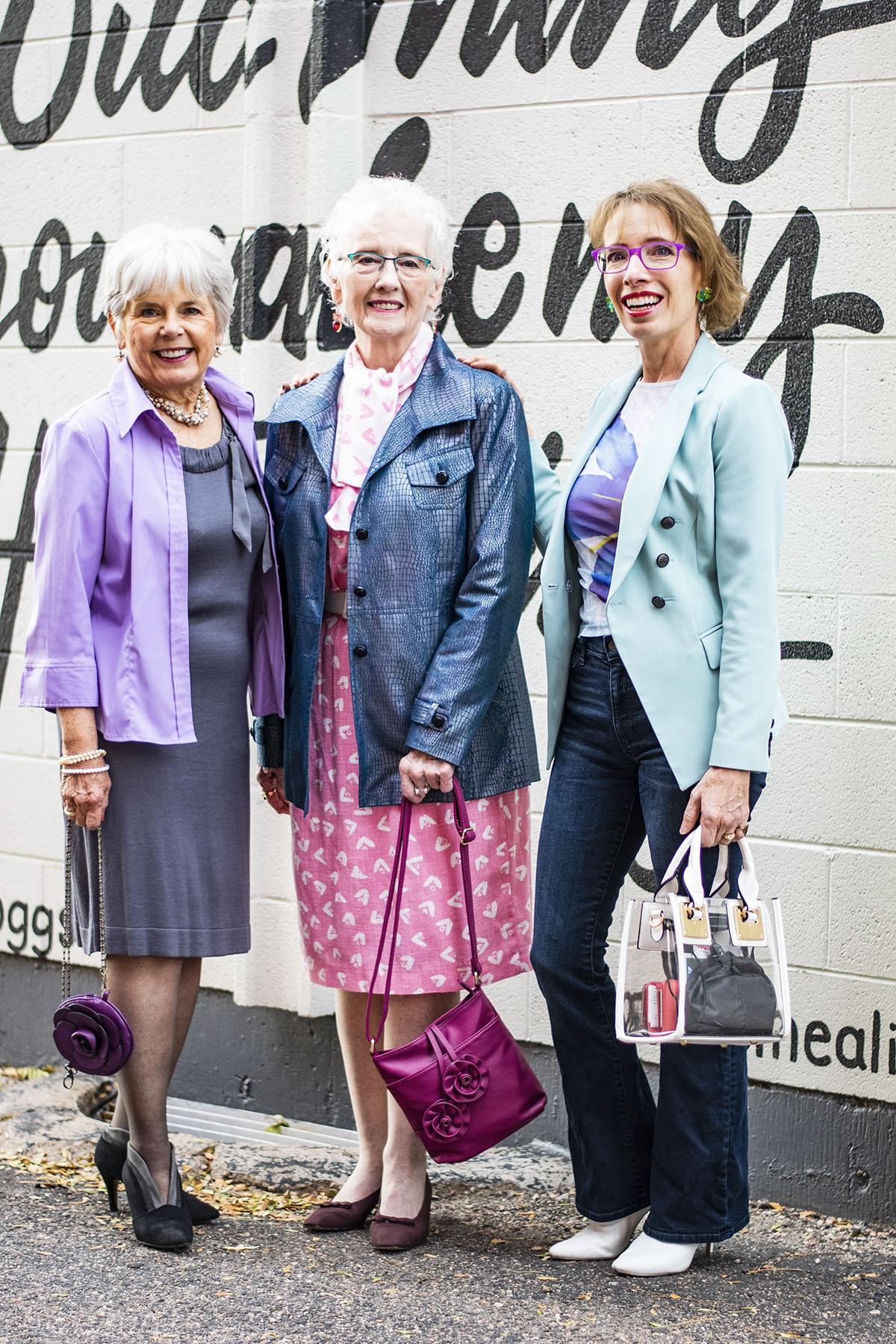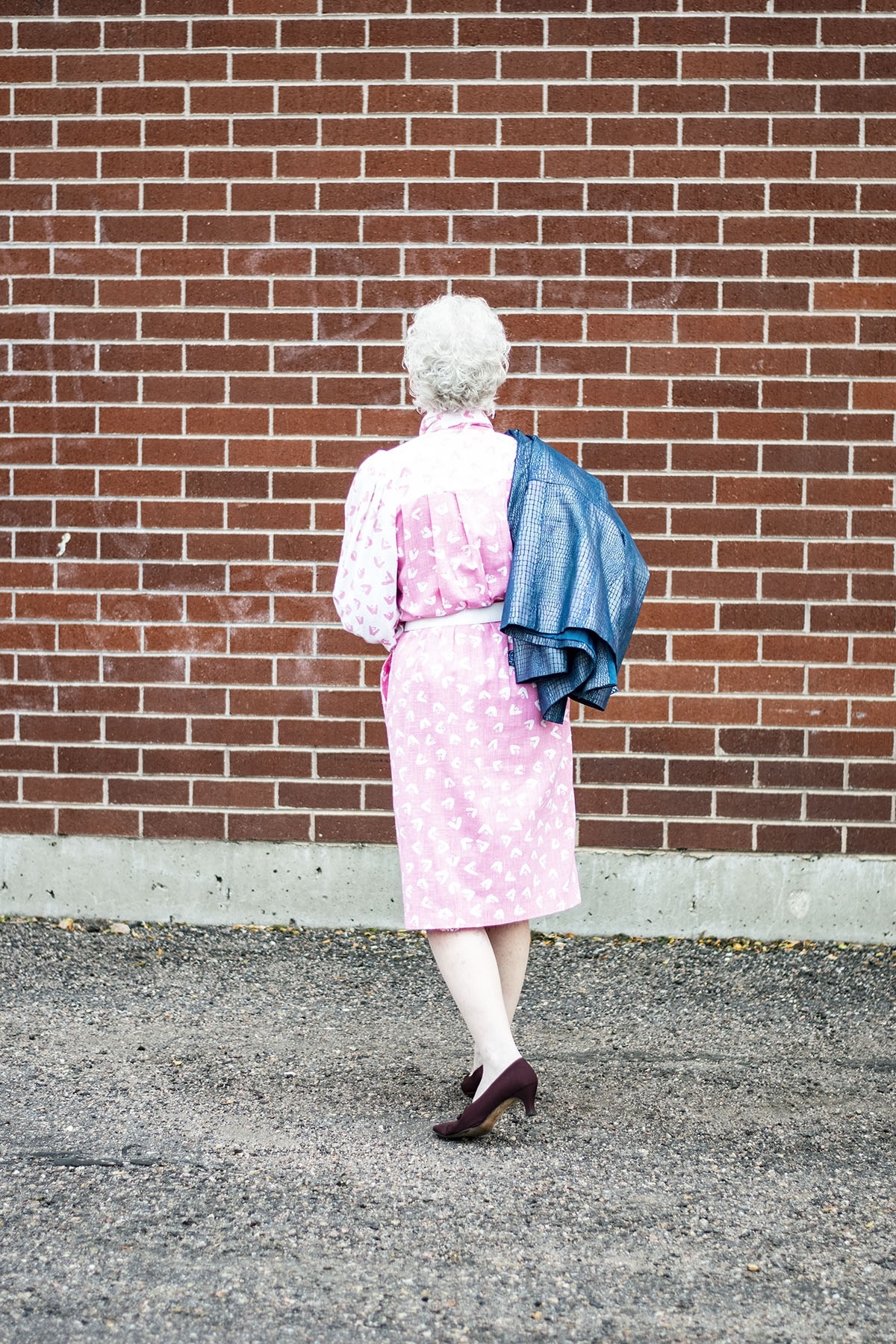 In order to “winterize” the dress, I suggested this dark blue jacket for another layer. And even though my mom would have normally worn her pink shoes with this dress, a darker shade of the same color can be a great way to finish it off.