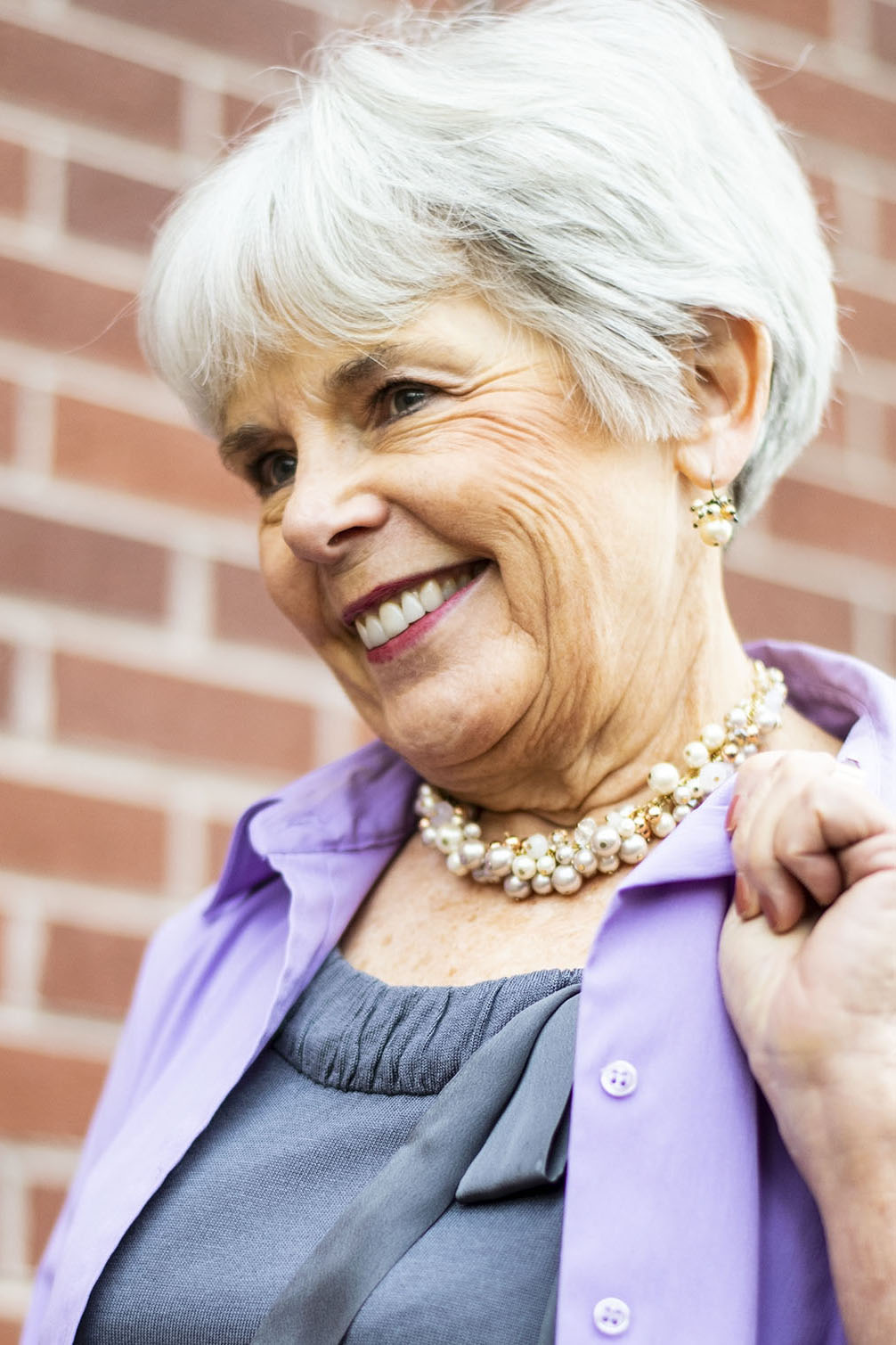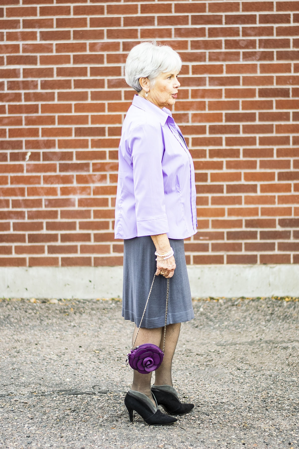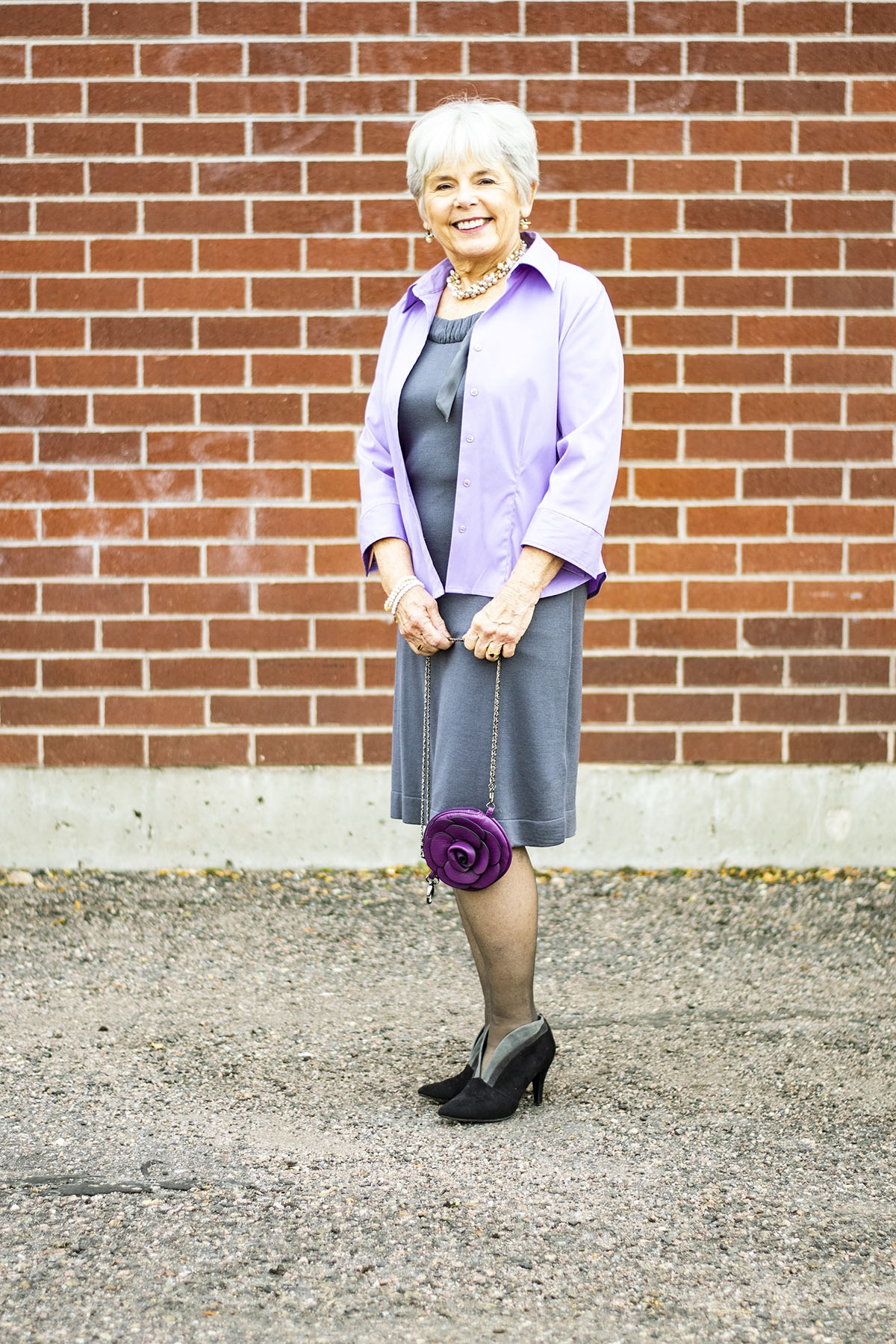 Lilac is one of the colors that looks good with Nancy’s cool coloring. And then the idea of wearing a button down shirt as a jacket is a great way to get versatile with our clothing. I thought this was a great way to make both pieces work since the dress is short sleeved yet is darker, and so feels less springy.
