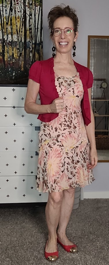 This is a dress my cousin gave me (a hand me down as we used to say). I love it except the color almost matches my skin. So I think it works best with some kind of contrasting color nearer my face.
